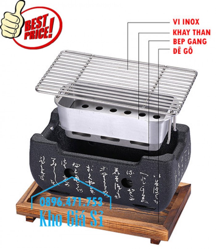 Bếp gồm các bộ phận: Thân bếp + đế gỗ + vỉ nướng inox