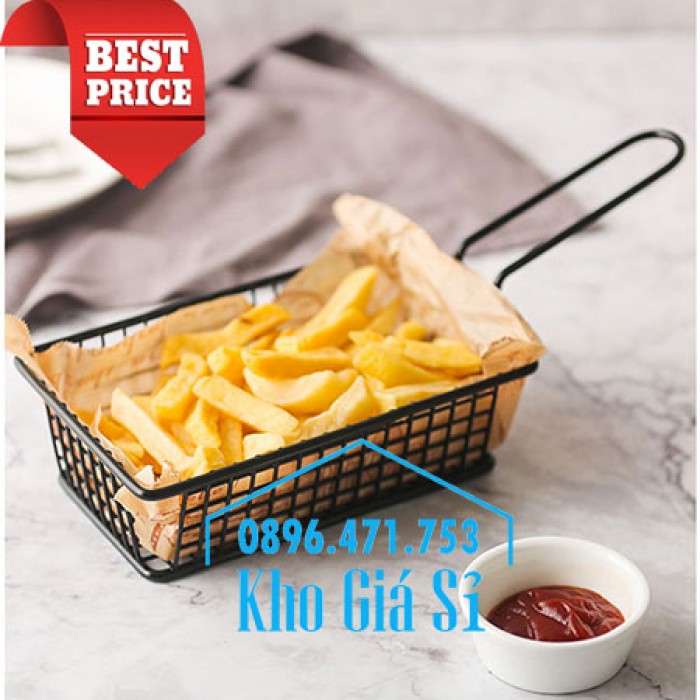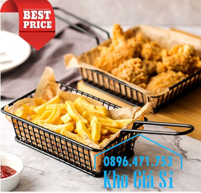 Giỏ inox chữ nhật màu đen có tay cầm đựng khoai tây chiên, gà rán KFC
