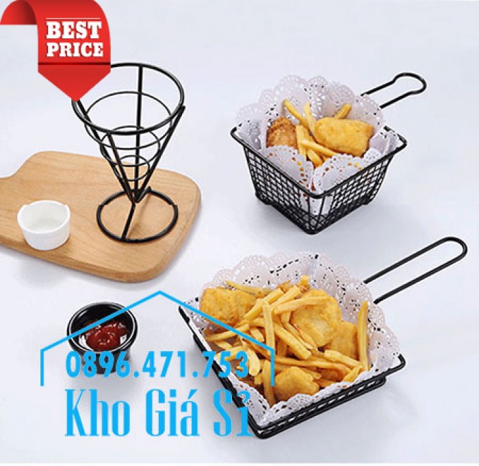 Giỏ inox chữ nhật màu đen dùng để đựng phục vụ khách khoai tây chiên, gà rán, khoai lang lắc...